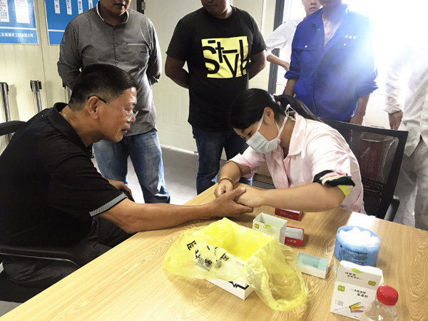 為了進(jìn)一步推行落實(shí)日式化管理,我司將對(duì)項(xiàng)目部逐步推行精細(xì)化管理。8月22日,我司特邀專業(yè)醫(yī)護(hù)人員為鳳凰創(chuàng)新園、余杭余政儲(chǔ)出二個(gè)項(xiàng)目部全體員工進(jìn)行血型檢驗(yàn)。一方面,便于項(xiàng)目管理人員的統(tǒng)籌管理,掌握項(xiàng)目部人員和班組人員的基本信息。另一方面,在明確每位工人血型后,將血型、工種、姓名等信息以二維碼的形式標(biāo)貼在工人佩戴的安全帽上,在發(fā)生意外后,根據(jù)工人血型及時(shí)采取有效救助措施,減少救援時(shí)間,提高救助效率,保障民工人身合法權(quán)益。