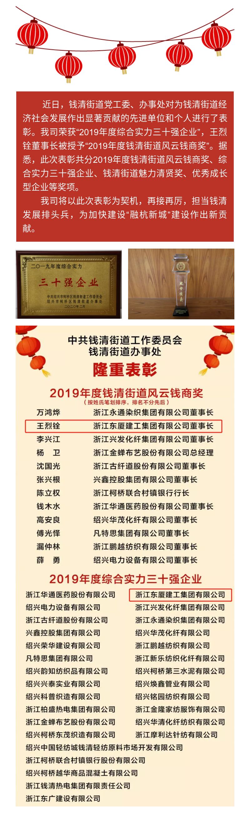 我司榮獲2019年度錢清街道表彰