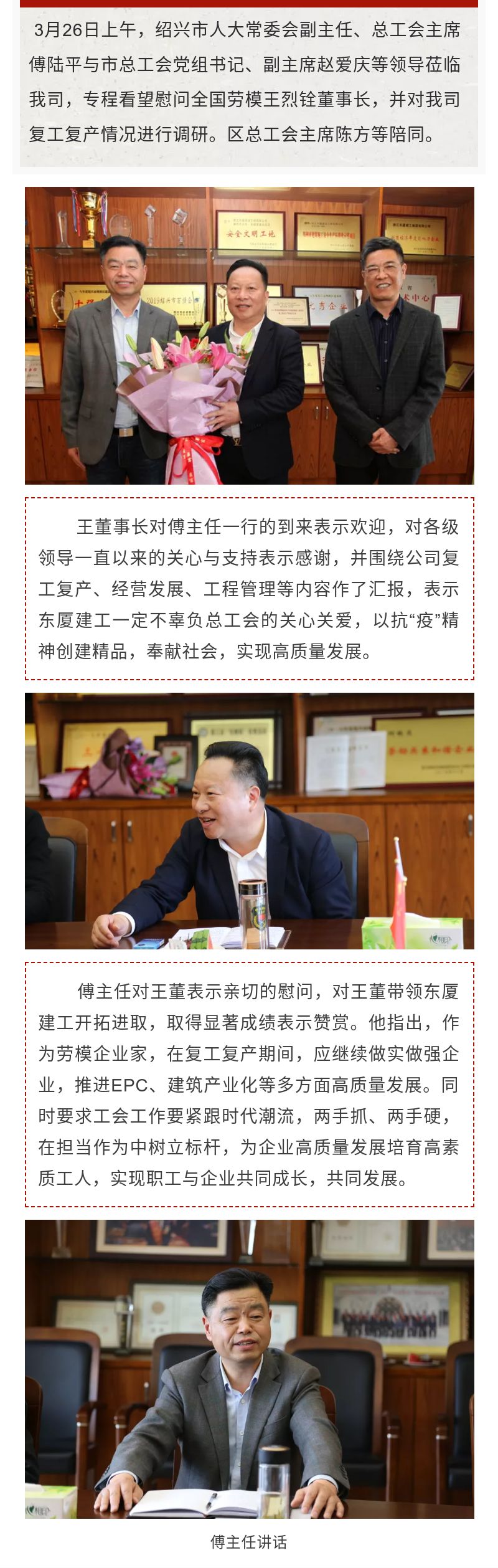 紹興市人大常委會(huì)副主任、市總工會(huì)主席傅陸平一行到我司慰問王烈銓董事長(zhǎng)