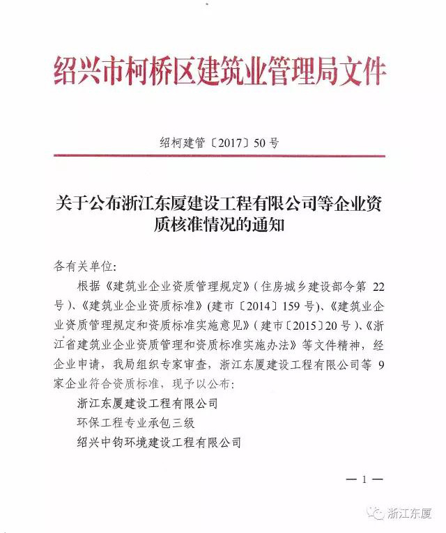 | 為進一步提高公司綜合競爭力,加強公司在經(jīng)營投標市場的優(yōu)勢,拓展公司經(jīng)營業(yè)務范圍。經(jīng)公司決定將承接環(huán)保工程業(yè)務作為我司拓展新領域,經(jīng)過前期的精心準備,我司基本具備環(huán)保工程專業(yè)承包條件,近日,經(jīng)柯橋區(qū)建管局審核,我司成功取得環(huán)保工程專業(yè)承包三級資質(zhì),能承接環(huán)境工程也是公司為社會承擔的一份責任和力量。 我司在資質(zhì)管理方面將持續(xù)攀升,主動出擊,克服困難,為公司長遠發(fā)展打基礎。