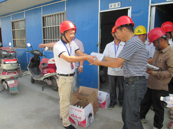 公司副總經理向福全農民公寓項目部人員發(fā)放高溫慰問品