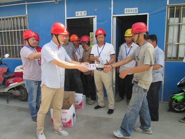 公司總經理向江橋華府壹號項目部人員發(fā)放高溫慰問品
