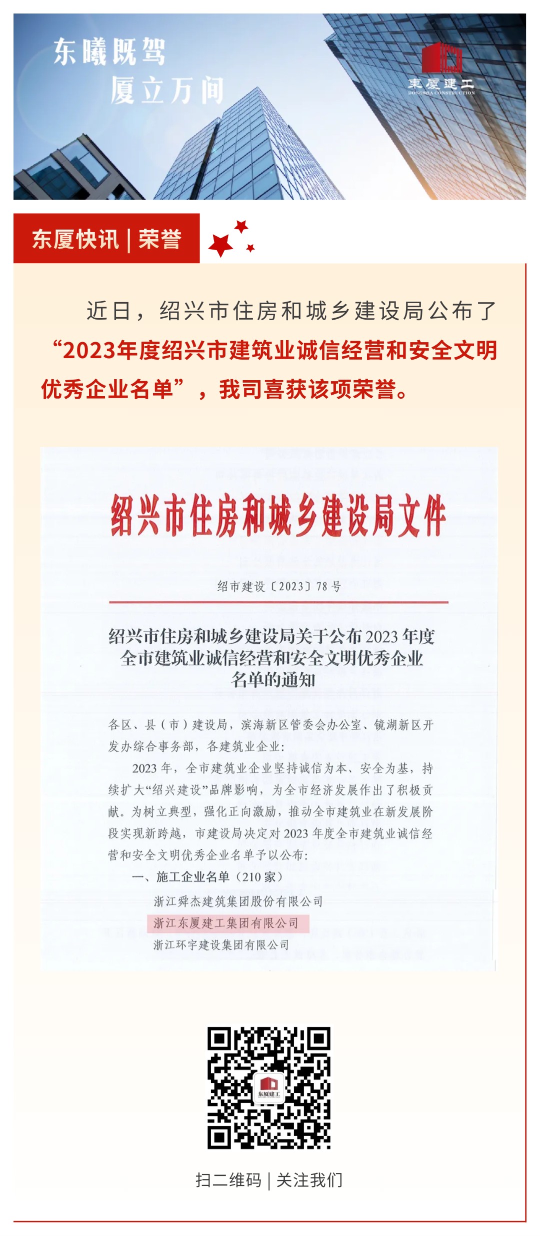 【東廈榮譽(yù)】我司榮膺紹興市建筑業(yè)誠(chéng)信經(jīng)營(yíng)和安全文明優(yōu)秀企業(yè)稱(chēng)號(hào)