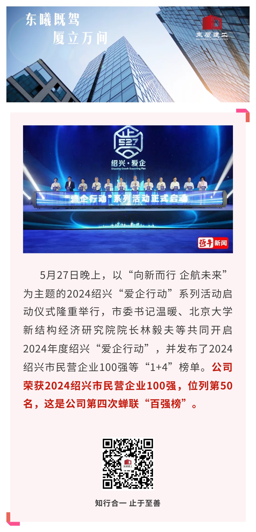 【東廈榮譽(yù)】公司四次蟬聯(lián)“紹興市民營(yíng)企業(yè)100強(qiáng)”